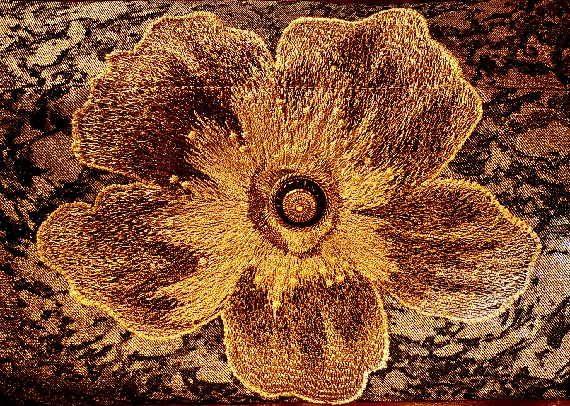 Realizzata in un pregiato tessuto jacquard dai toni nero, argento e bronzo, presenta un affascinante gioco di luci e texture. Al centro domina un fiore ricamato in rilievo, ricchissimo di sfumature dorate e rame, impreziosito da un bottone gioiello centrale che richiama l’estetica barocca siciliana — un omaggio iconico al DNA di JLAdore Couture.