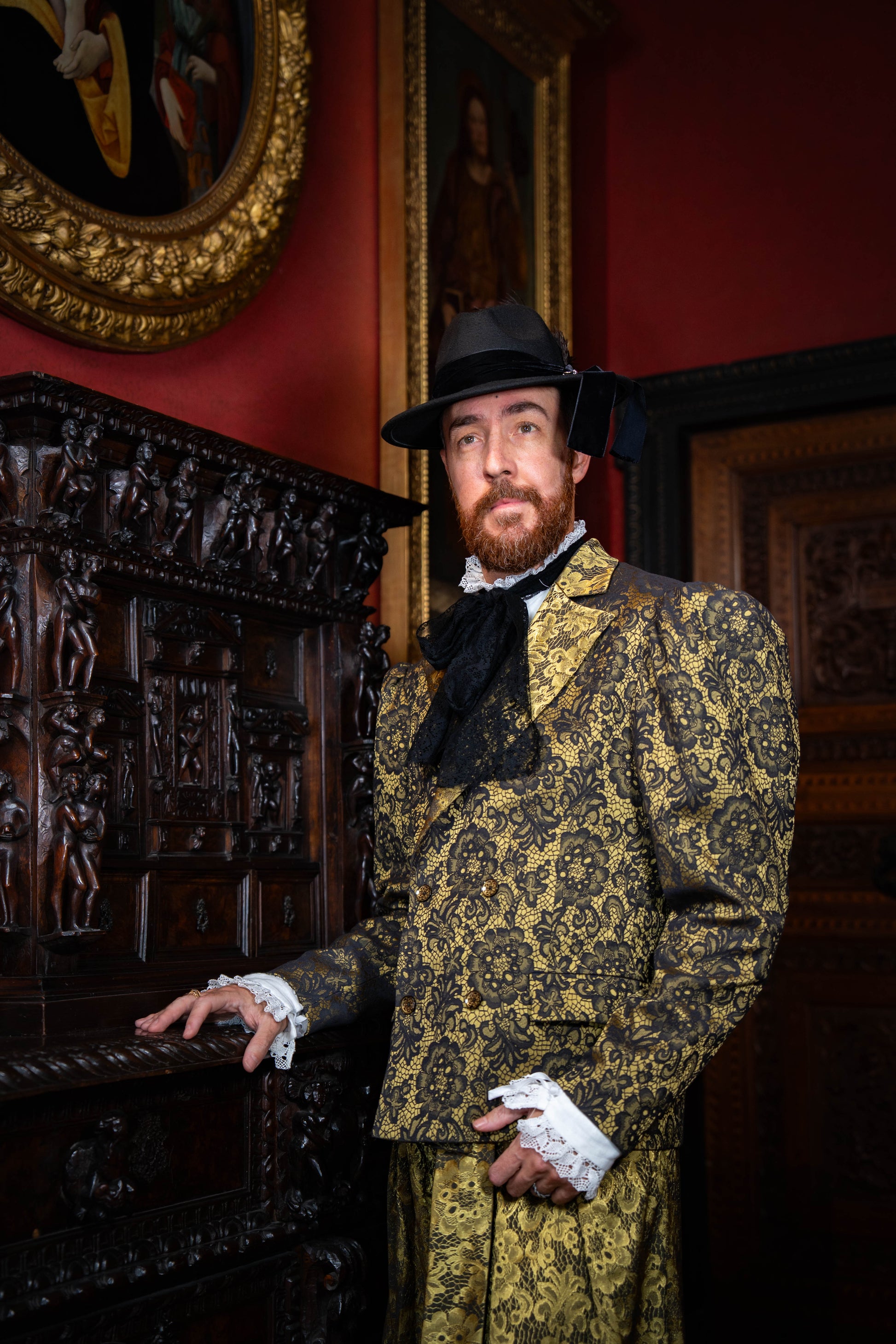 Il Principe di Salina indossa un completo in prezioso damascato di lana e seta nei toni profondi dell’oro e del nero, un tessuto che cattura la luce come un mosaico barocco.